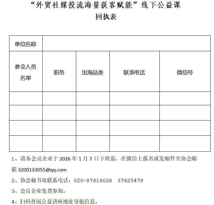 但多数企业仍面临“社媒工具不会用、海外获客无方法、投流转化没效果” 等实操难题。为此,协会特联合外贸社媒投流出海TOP-IP博主举办「外贸社媒投流海量获客赋能」线下公益赋能课,聚焦 “从 0 到 1 实操落地”,掌握社媒 + AI 获客的实战干货。助力企业“出海”快速获客。