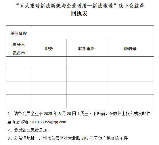 为助力会员企业及时洞悉新法动态,协会特邀请协会法律顾问——广东茂文律师事务所何国瑜律师,于2025年8月21日(周四)举行线下公益课。