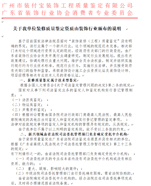 我单位 “广州市装付宝装饰工程质量鉴定有限公司”在业务上受广东省装饰行业协会消费者专业委员会的监督与指导,主要承接:装修装饰消费投诉中装修工程施工质量的鉴定、设备安装施工质量鉴定、装修工程修复造价评估、装修工程造价审核、装修工程修复方案、新房验收、装修过程阶段性验收、石材(瓷砖)放射性检测;提倡“先装修,后付款”的新消费理念,推广《广东省室内装饰装修工程施工合同》简称“三方装修合同”,杜绝霸王条款及装修陷阱!